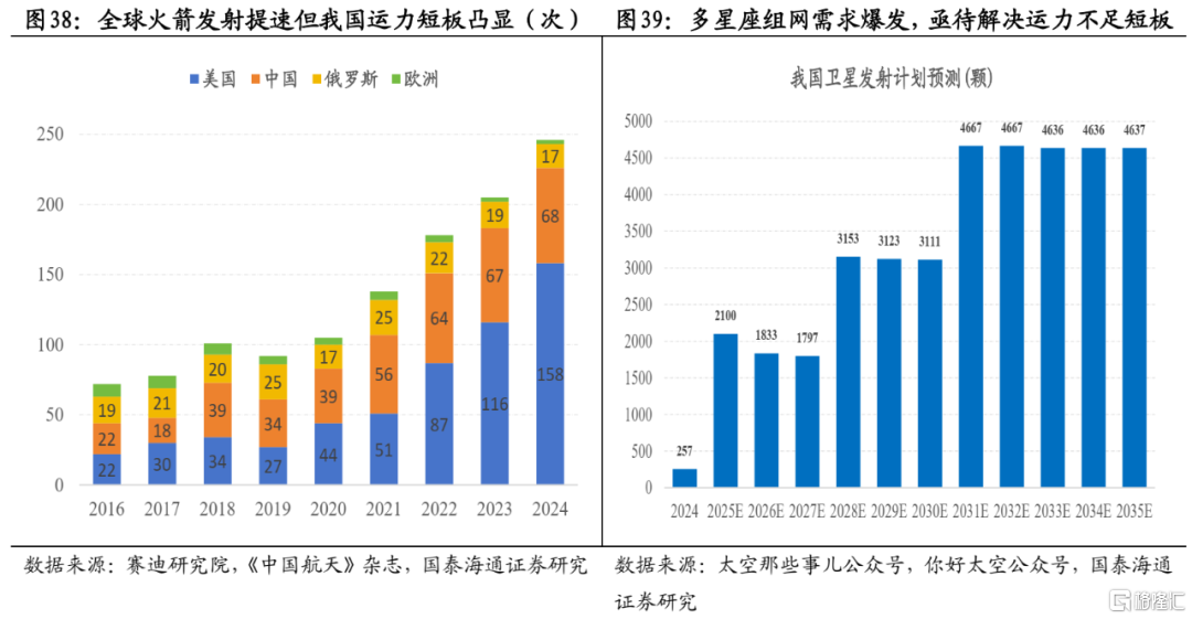 民营商业航天公司蓝箭航天朱雀三号重复使用遥一运载火箭入轨成功,中型可重复使用运载火箭长征十二号甲发射在即,首款运力突破20吨的大型可复用液体火箭天龙三号“一箭36星”地面验证试验已全部完成。此前,国家航天局印发《国家航天局推进商业航天高质量安全发展行动计划(2025—2027年)》,提出加大大型试验设施设备向商业航天主体开放共享力度,重点支持商业航天主体开发新技术、新产品,挖掘应用新场景。预计2030年我国年卫星发射需求较2024年增长10余倍,亟待解决运力不足与成本短板。面向我国大型星座组网任务的多款火箭进入发射周期,大运力、可重复使用、一箭多星等技术的应用推动高可靠、低成本、高频次发射,加速我国商业产业规划发展。