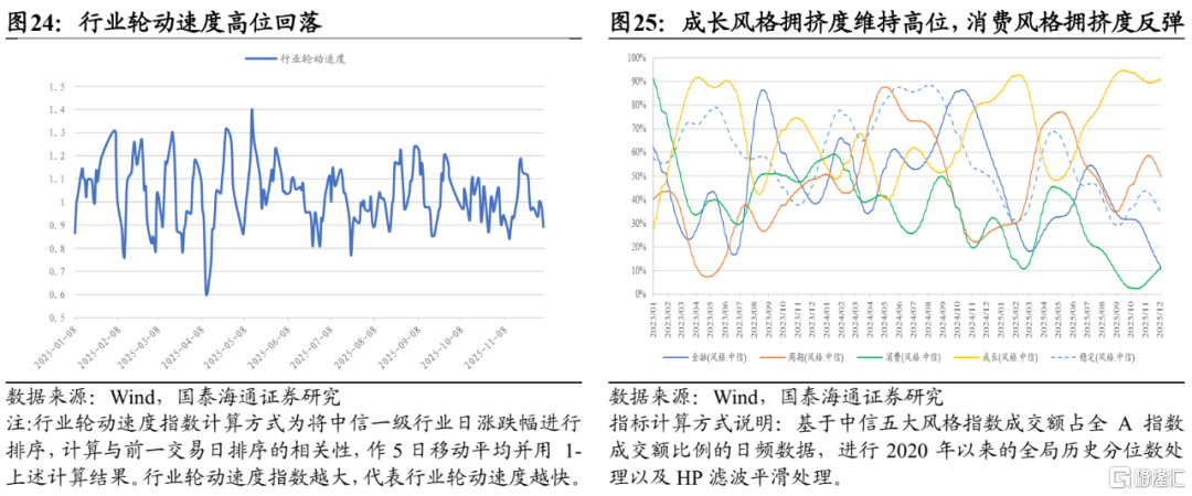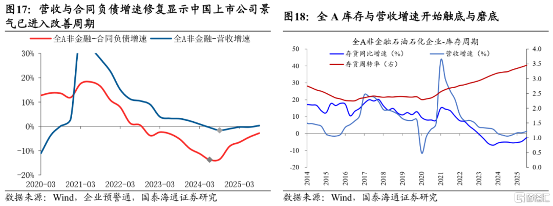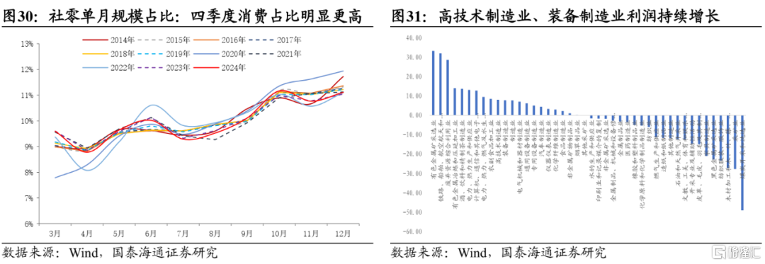 顺周期低估值且低拥挤,其中景气边际改善赛道股价弹性较大。顺周期板块在历经三年景气下行压力与股价调整后,当前处于寻底阶段,但结构上我们注意到已经开始出现边际改善的信号。从社零结构看,10月餐饮、非汽车商品增速环比改善。商品中,必选消费品多数环比改善,其中饮品改善明显,可选消费品中没有补贴的相关品种近几个月边际改善明显,如服装、化妆品、首饰与药品。从价格数据看,扣除波动较大的食品和能源后核心CPI、以及服务CPI改善幅度明显好于CPI整体,服务消费景气度较高。结合三季报线索看,尽管消费业绩整体仍承压,但存货的加快与控费力度的增强仍然支撑了报表的质量。从盈利改善视角,我们认为可以把握两种线索,其一,是符合情绪消费、平价消费等新消费的赛道不同程度上出现了基本面改善与成长性提升的信号,存在产品创新和渠道开拓的公司具备成长优势。如产品迭代创新的饮品、化妆品、调味品与个护等毛利率改善,休闲食品、旅游景区等效率提升的行业存货周转明显加快。其二,是随着经济复苏线索的扩散,商旅需求以及错峰出游需求也逐渐改善,部分经营杠杆较重的服务消费行业业绩出现边际改善,行业内出现提价信号,如航司客座率的改善,以及酒店RevPAR的改善。此外,从季节性效应来看,四季度往往是消费品传统旺季,一方面,社零单月规模占比显示,四季度社零在全年的占比明显偏高。我们认为,在政策持续落地与居民收入预期触底改善的背景下,消费龙头估值有望迎来修复机遇。从生产端角度看,美联储降息带来的流动性宽松和AI投资带来的实物需求上升共同推升基本金属需求,而以铜铝为代表的基本金属在矿产、冶炼等方面受到限制,预期工业金属的价格中枢将稳步上升。2025年1-10月工业企业利润增速有所放缓,保持修复态势。结构上,新质生产力成为利润驱动主力,高技术制造业、装备制造业成为工业企业高质量发展的主要动力,传统产业中的新质生产力表现积极。另一方面,本轮“反内卷”与全国统一大市场通过优化资源配置与竞争环境,推动经济从“卷价格”向“优价值”转型,相对上一轮供给侧改革更加侧重于供给的高质量优化而非简单的产能出清。综合来说,我们推荐关注大众品、零售、酒店、航司、工业金属、电机电源设备、机械设备。