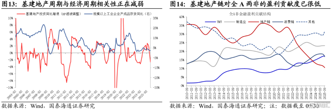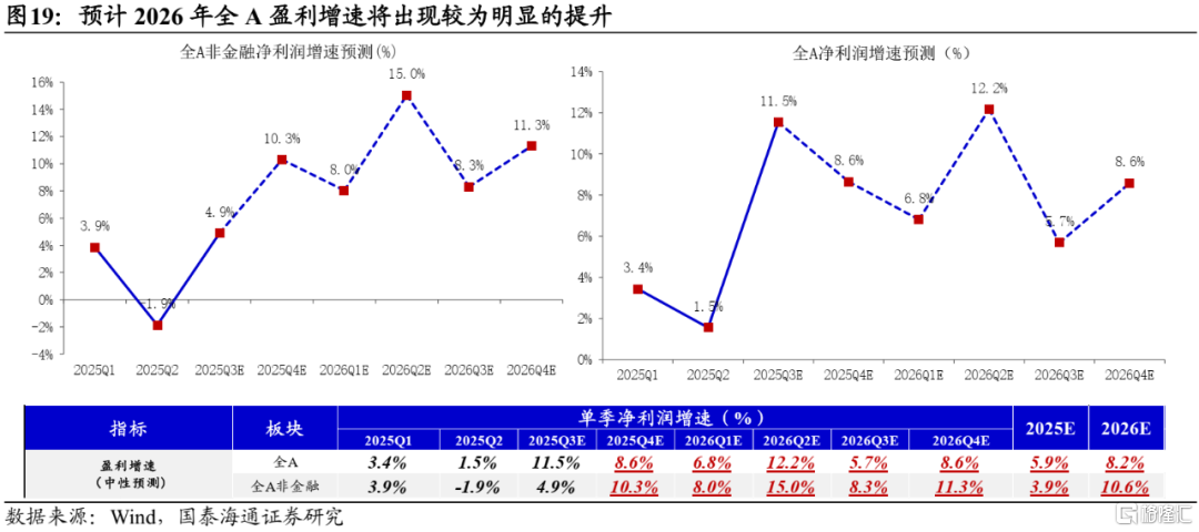 ▶资本市场进入新历史阶段:中国社会与经济发展的连接和纽带。资本市场如今在提振信心、凝聚共识和推动转型上具有四两拨千斤的作用。但除此之外,非常容易被忽视的是:在城镇化发展和劳动力密集型产业发展时期,经济个体能够固定资产投资或付出劳动时间来参与经济生产力的提高,人均GDP和人均可支配收入的关联程度较高。但进入转型期后,新技术趋势和新商业需求,以及如今中国制造业的全球扩张,更多的体现为知识密集型与资本密集型产业。那么,经济个体已较难通过简单的固定资产投资和付出劳动时间参与生产力提高。如今中国的资本市场处在历史未有的变化上,股权成为新的分享和参与经济发展和产业发展的纽带。市值占比结构也能表征类似的变化,制造业(27%)>TMT(21%)>金融(17%)>消费链(12%)>地产链(9%)。由此,股市的上升可以由新增长打开空间,而不必依赖地产。中国经济基本面传统增长拖累的减小、新技术行业进入扩张的周期以及制造业的全球扩张,经济社会发展的不确定性是降低的,2026年全A非金融业绩增长有望达到10.6%。