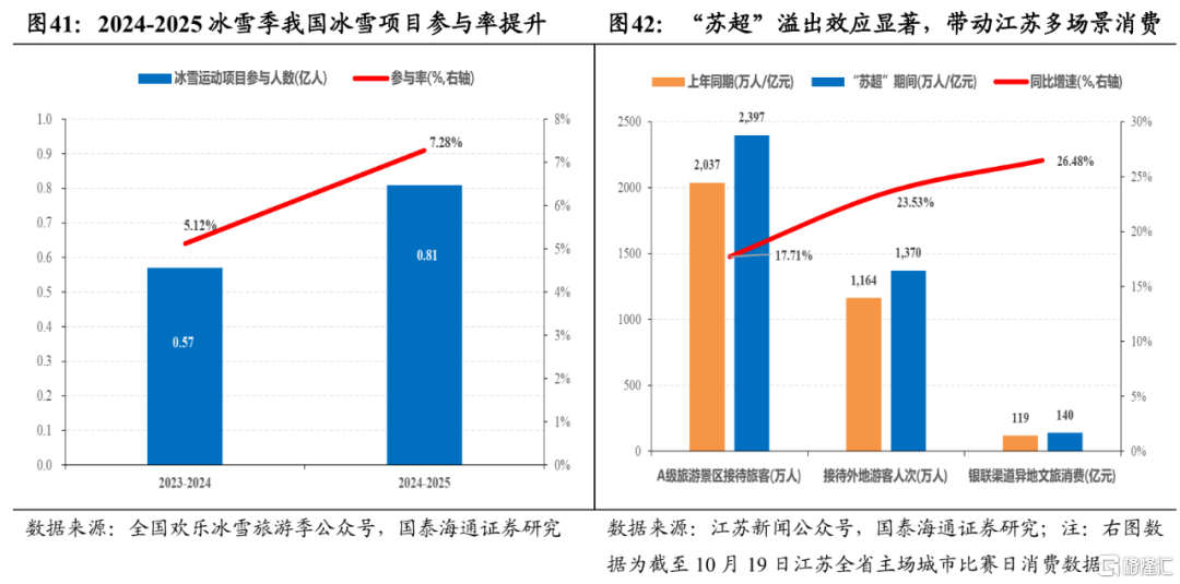 投资建议:政策推动与新场景兴起,服务消费成为拉动经济新动能。六部门联合印发《关于增强消费品供需适配性进一步促进消费的实施方案》,提出以消费升级引领产业升级,以优质供给更好满足多元需求。此前,国常会提出增强供需适配性释放消费潜力,培育消费新场景新业态。新需求引领新供给,新供给创造新需求,我国体育赛事/冰雪旅游/演出文旅等新消费场景不断兴起。“苏超”溢出效应显著,已带动江苏全域多场景消费超380亿元;辽宁省委提出办好“东北超”,努力打造具有全国影响力的足球赛事品牌;2024-2025冰雪季,我国冰雪运动消费规模超1875亿元,同比增长25%。