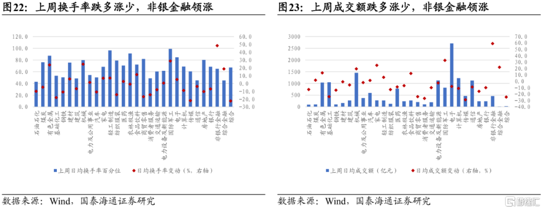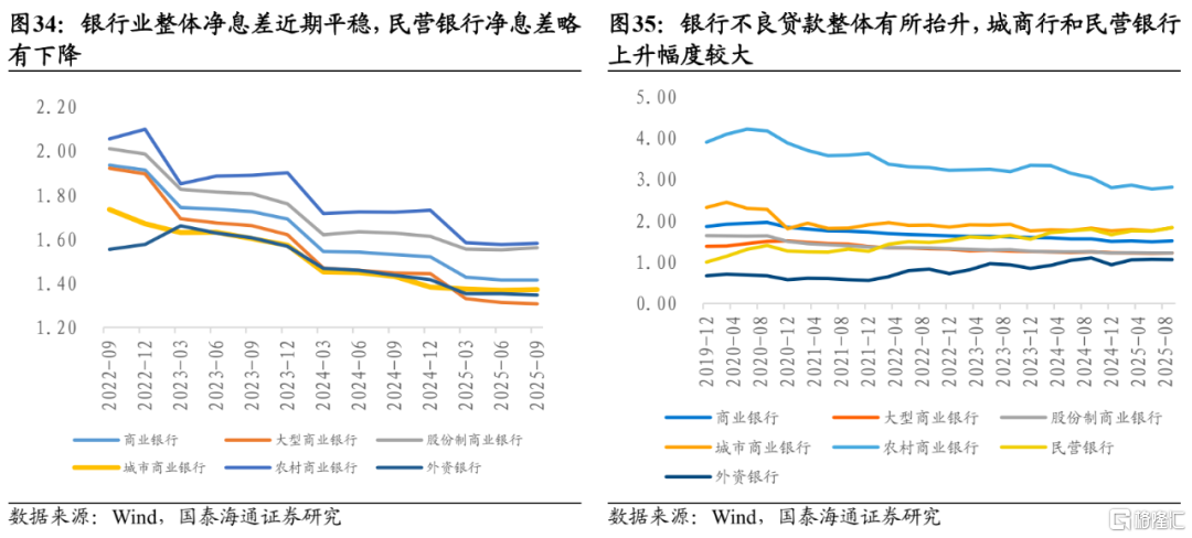 大金融:稳定与活跃市场的重要抓手,估值与股价处于低位水平。市场当前对于前期强势主线出现分歧,但无风险收益率下沉的环境中又难以系统性降低权益仓位去增持其他低收益率的资产,因此大金融成为当前投资者替代现金的重要选择。大金融股票一方面是稳市机制的重要抓手,另一方面景气也边际有所提升,其中非银充分受益资本市场改革与交投活跃,而银行则也同样受益财富管理业务回暖与零售信贷的边际修复。六大国有银行近日集体下架五年期大额存单。仅剩的三年期产品利率普遍降到1.5%至1.75%,且额度紧张。与此同时,部分中小银行也开始调整甚至直接取消三年期、五年期普通定期存款产品。长期存款产品“退潮”趋势正在银行业蔓延。这一现象反映了银行业普遍面临的净息差压力。根据国家金融监管总局11月14日公布的2025年三季度银行业保险业主要监管指标数据,民营银行净息差环比下降0.08个百分点,行业整体面临相似挑战。从净息差来看,相较于2025年上半年,2025年前三季度商业银行净息差环比维持不变,成为支撑累计净利润降幅收窄的重要因素。这是2022年初以来,境内商业银行净息差首次出现季度环比保持不变。考虑到净息差的变化具有一定季节性,未来境内商业银行净息差或仍将继续磨底。值得注意的是,2022年初以来,股份行、城商行、农商行的净息差均曾短期出现过环比上升情形,而国有大行净息差持续呈现环比下降态势。此次调整背后,是银行业净息差收窄压力的体现,中小银行尤为突出。从深层逻辑看,中小银行在揽储能力和品牌信任度上通常弱于大型银行,此前依赖高息长期存款吸引客户的模式已难以为继,因此减少长期限高成本存款、优化负债结构成为必然选择。从不良率角度观察,银行不良贷款整体有所抬升,城商行和民营银行上升幅度较大,而大型商业银行和股份制商业银行仍具备一定腾挪和操作空间。除此之外,头部券商并购加速也有望提升券商综合实力,提振市场情绪。我们认为当前仍然需要重视大金融资产在主线震荡分歧期间的配置意义。推荐:券商/保险。