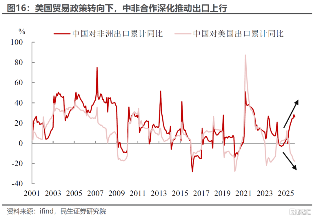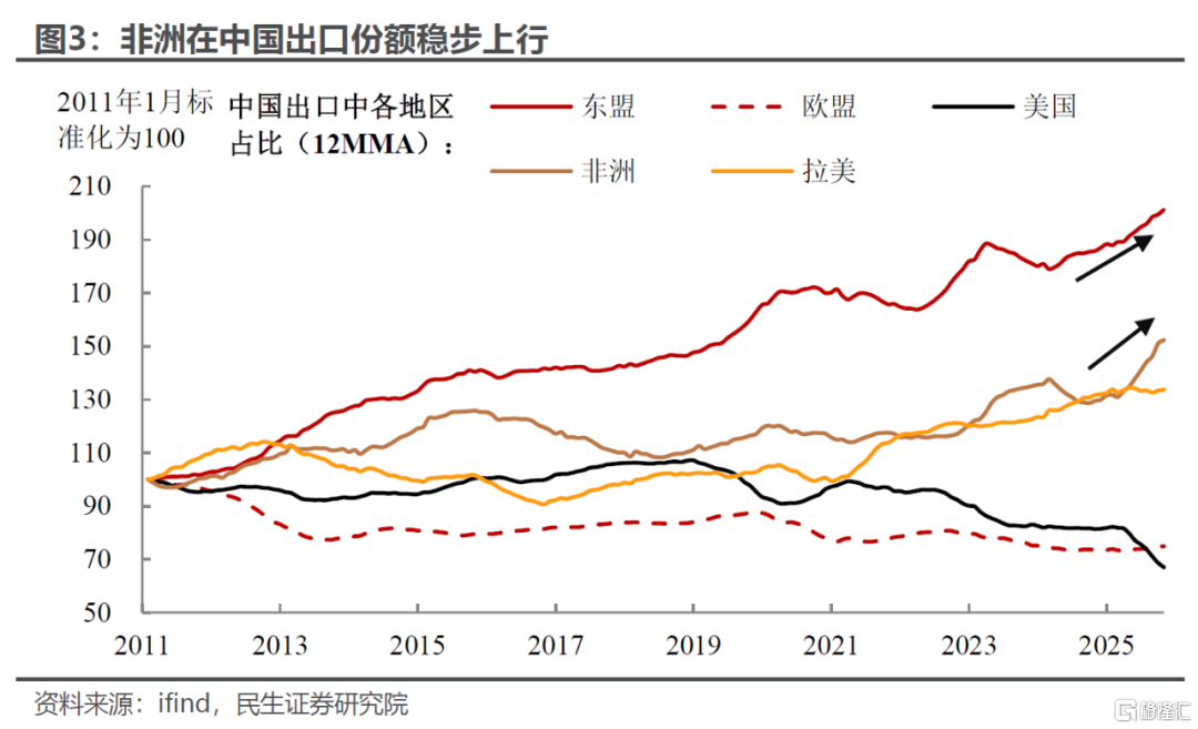 非洲经济温和复苏,贸易增长基础稳固。根据IMF预测,2026年撒哈拉以南非洲GDP增速由4.1%进一步回升至4.4%,经济需求依然强劲,叠加中国在非洲市场的加快布局,中非贸易有望继续得到支撑。
