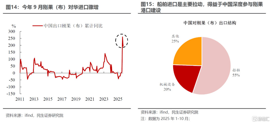 其中,刚果(布)的潜在变化尤其值得关注,在船舶进口的大增下,1-10月刚果(布)对华进口大增至193%,9月单月就贡献了非洲当月对华近三分之一的进口增速。主要原因在于,一方面中国深度参与刚果(布)港口基础设施建设,包括黑角港东部码头扩建等正稳步推进;另一方面,今年9月中刚两国高层会面,将双边关系定位提升为中刚高水平命运共同体,预计将在基础设施等领域展开更积极的合作。