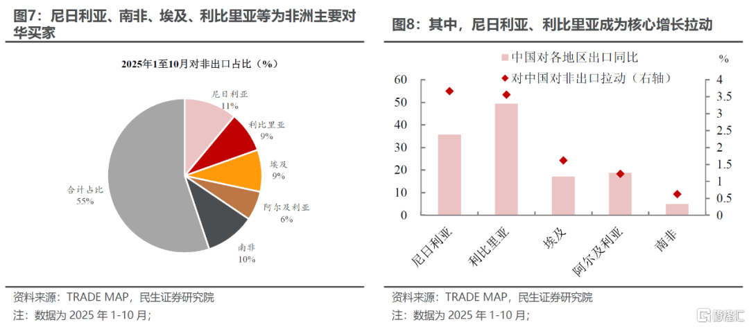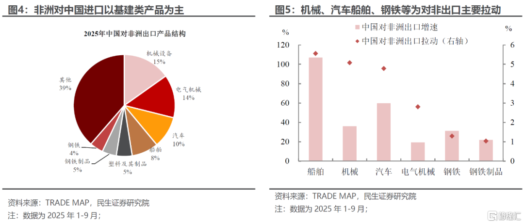 从产品上,基建需求主导下,机电产品占非洲自华进口绝对比重。其中,机械设备、电气机械、汽车、船舶、钢铁及其制品等五类基建相关产品,占非洲自华进口机电产品的绝对比重(合计约55%),贡献了今年以来对非出口增速的75%,成为拉动出口的核心引擎。