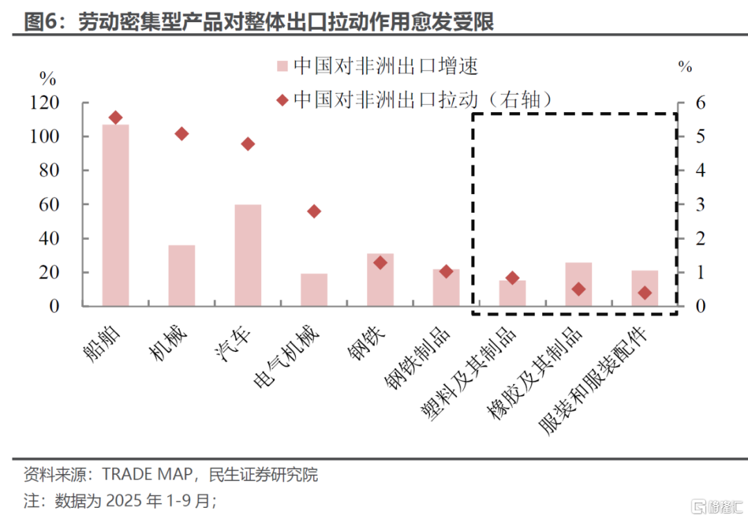 而相较机电产品的高增长,劳动密集型产品对整体出口拉动作用愈发有限。塑料橡胶、家具、纺织服装及鞋类等劳动密集型产品虽仍有一定份额,但因中国低端产业转移、本地产业保护及东盟等地区的竞争,在非洲自华进口中占比整体下行、增速放缓,对整体出口增长的拉动作用较弱。