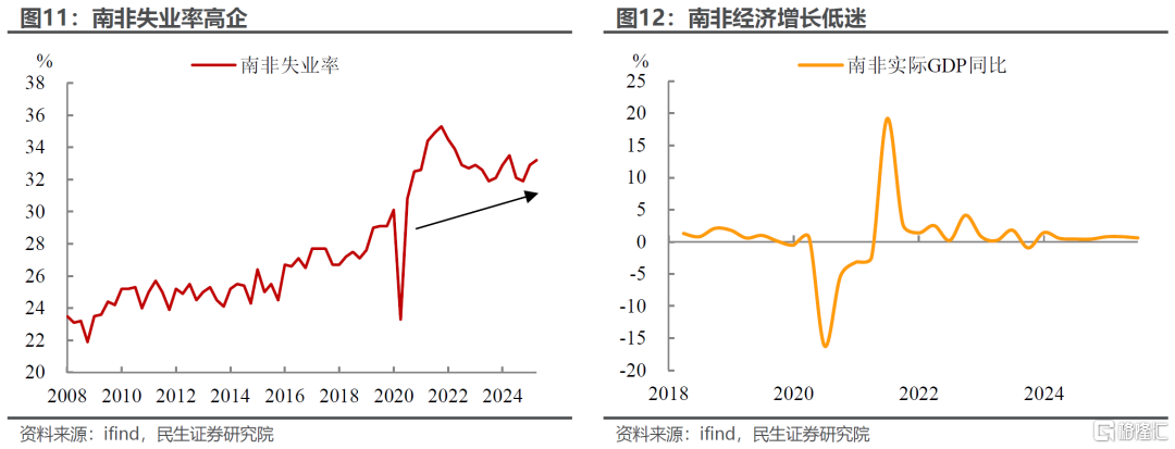 除此之外,埃及、阿尔及利亚及南非增速相对偏缓,尤以南非为甚——1-10月对华进口仅增长5%,成为非洲对华贸易中的“差等生”。在电力短缺和能源供应的不稳定、债务规模攀升以及高失业率等因素共同推动下,南非国内经济面临严重困境。叠加今年以来美国加征关税对其汽车、农产品出口的扰动,经济增长动能被严重侵蚀,对中国商品的拉动作用显著受限。