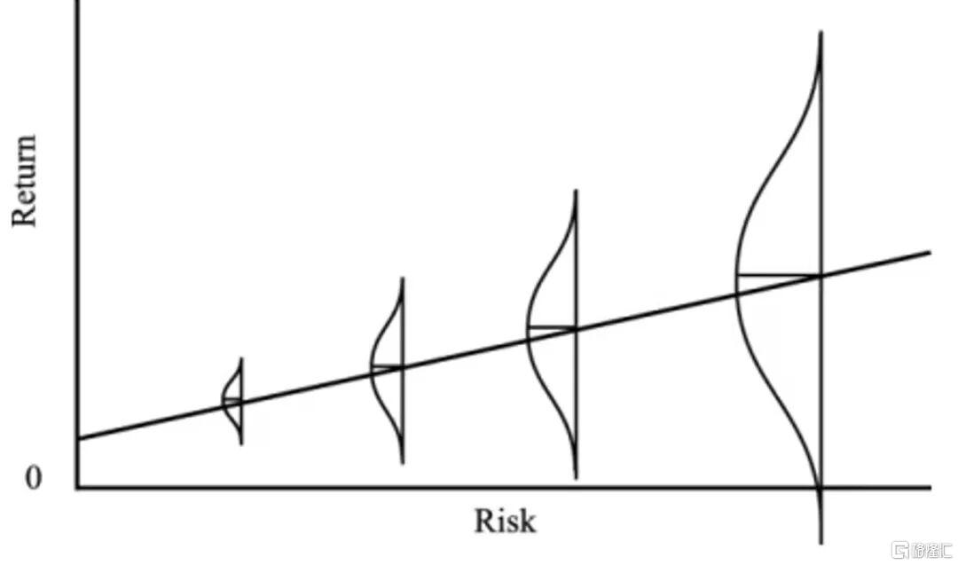 我们说的正是那张图的逻辑。你从左往右走(也就是承担更多风险),期望收益会增加,但可能结果的波动区间也会扩大,而坏结果也会更坏。