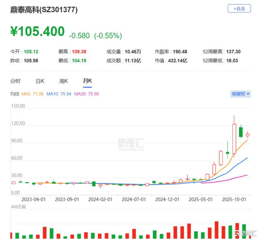 鼎泰高科2022年11月在创业板上市,股票代码:301377.SZ。截至2025年12月8日收盘,公司股价105.4元/股,市值432.1亿元。