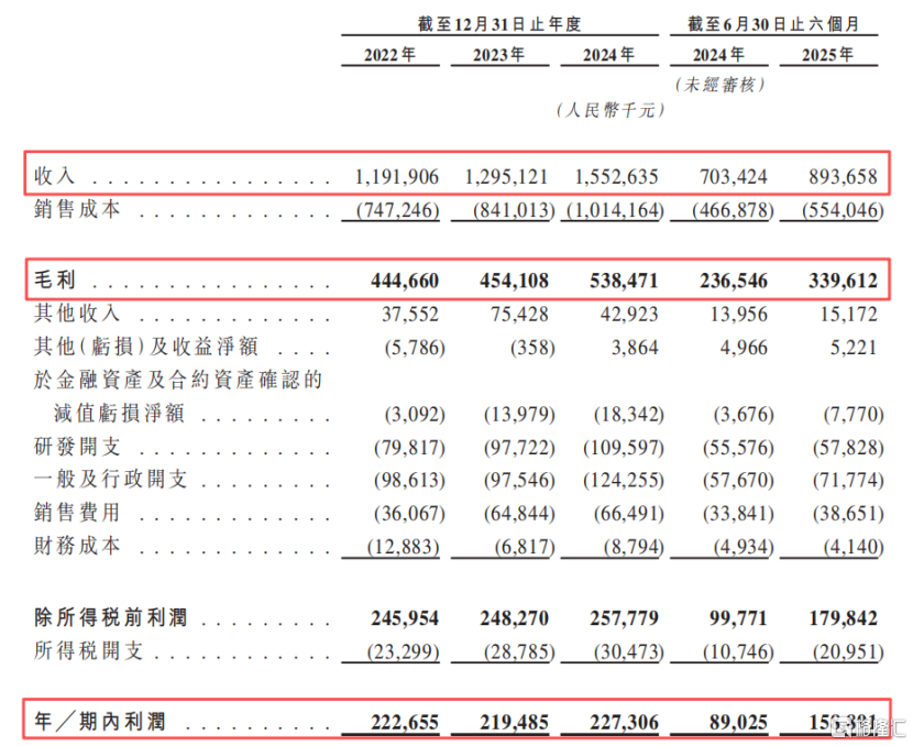 2022年、2023年、2024年及2025年1-6月(报告期),公司的收入分别为11.92亿元、12.95亿元、15.53亿元、8.94亿元,净利润分别为2.23亿元、2.2亿元、2.27亿元、1.59亿元。