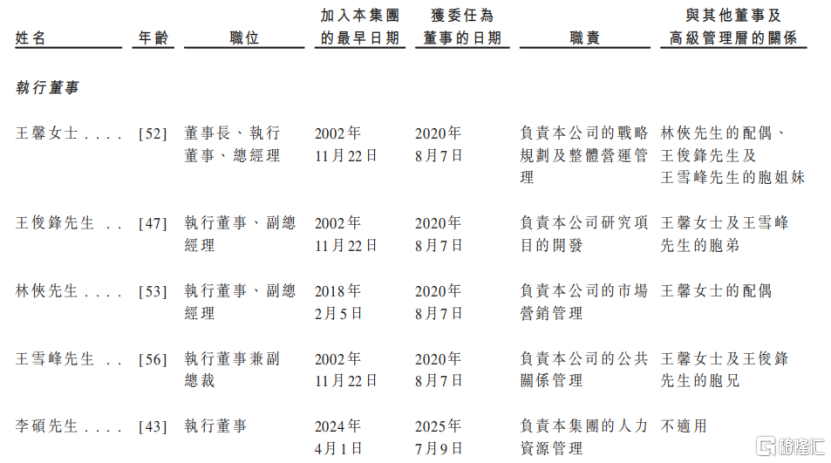 王馨的弟弟王俊锋先生,以及哥哥王雪峰先生均在公司任执行董事,其中王俊锋主要负责研究项目的开发,王雪峰负责公共关系管理。