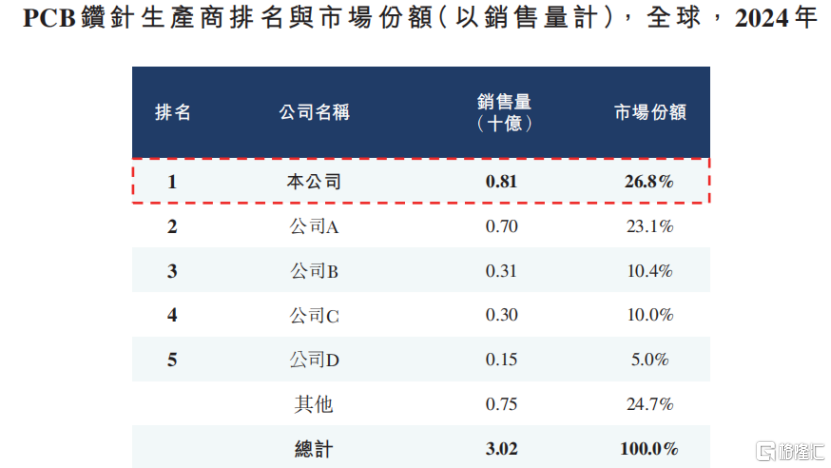 根据弗若斯特沙利文的统计,以销量计,公司过往几年在全球PCB钻针供应商中排名第一位。