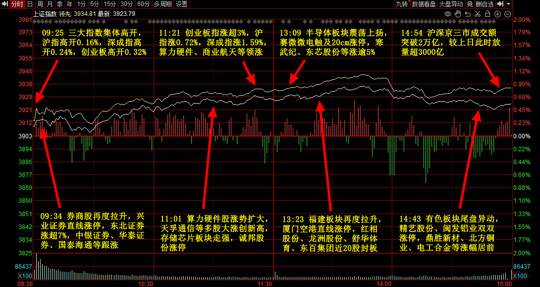 市场今日高开高走,创业板指盘中涨超3%。算力硬件股集体爆发,天孚通信、中际旭创等多股创新高。福建本地股全线走强,永辉超市、安记食品等近20股涨停。商业航天概念延续涨势,航天动力、航天科技等十余股涨停。个股涨多跌少,沪深京三市超3400股飘红,今日成交突破2万亿,较上日放量超3100亿。