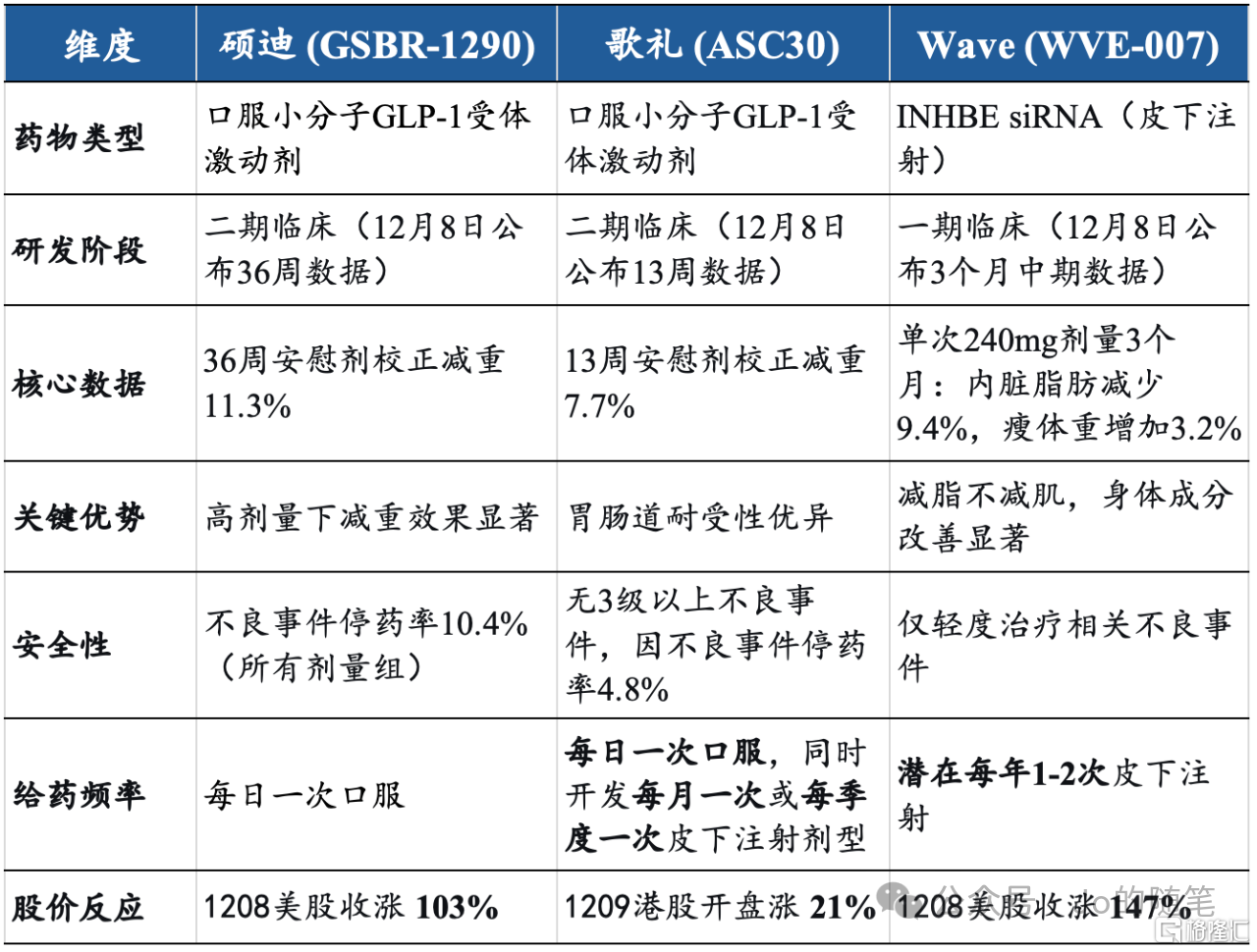 Wave生命科学(12月8日收涨147%)的WVE-007则是采用了一种全新的作用机制,靶向沉默INHBE基因。这是一种RNA疗法,与传统的GLP-1受体激动剂有本质区别。其公布的一期临床中期数据显示,单次注射240毫克剂量3个月后,受试者的内脏脂肪减少了9.4%,而瘦体重(肌肉)增加了3.2%。这一“减脂不减肌”的效果,直接击中了当前GLP-1减肥药的最大痛点 - 肌肉流失。更令人关注的是,基于RNA疗法的特性,WVE-007可能实现每年仅1-2次的给药频率,这将极大提高患者依从性。