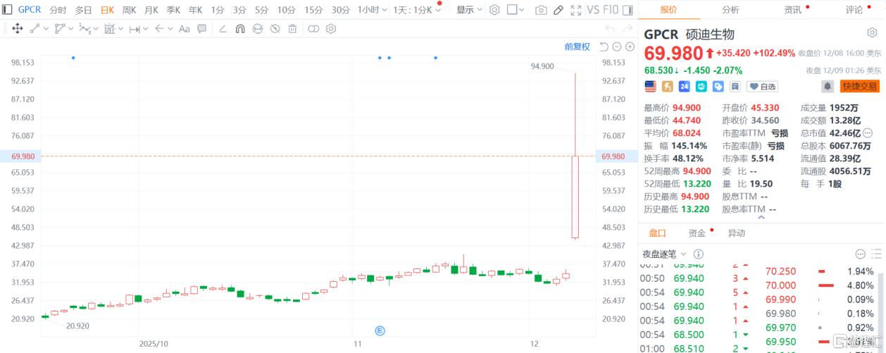 硕迪生物涨幅高达102%;Wave Life Sciences当天股价大涨147%,市值达到31亿美元。