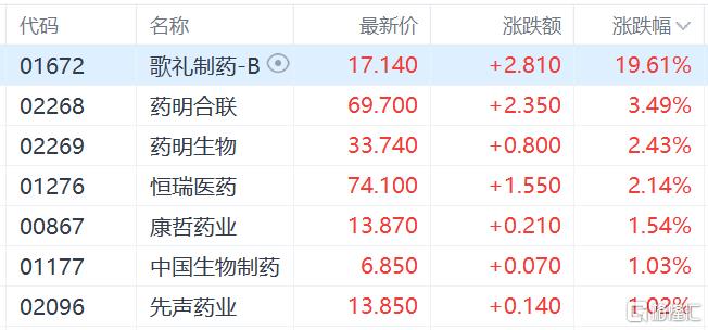 港股创新药概念走强,歌礼制药一度飙涨超20%,药明合联、药明生物、恒瑞医药等跟涨。