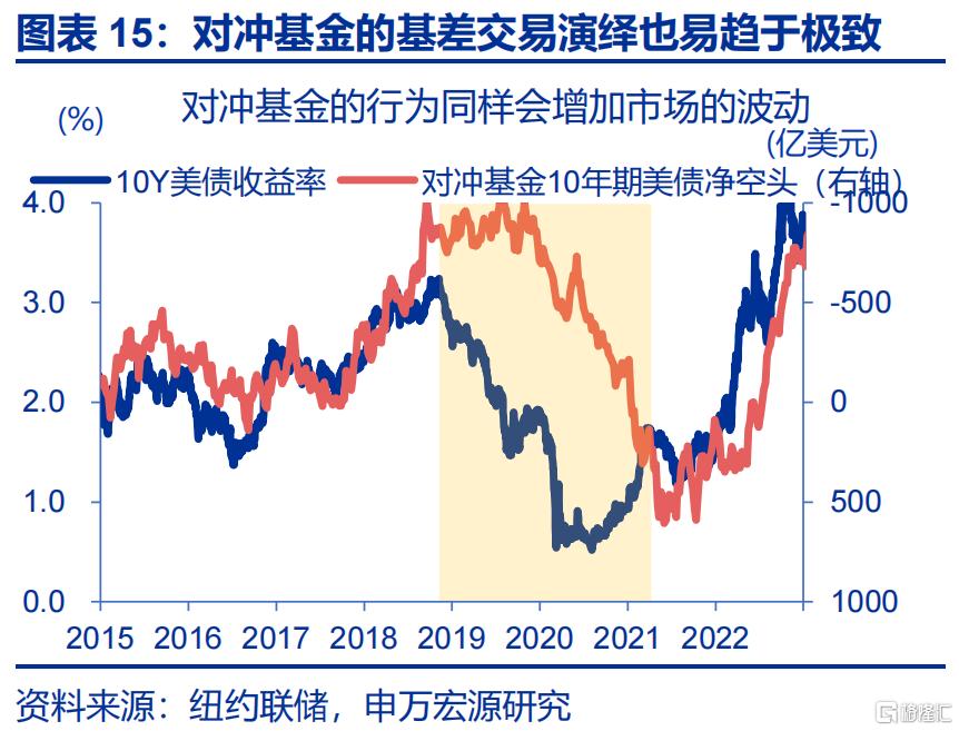 低利率环境下,机构为增厚收益而采取的“同质化策略”与拥挤的交易行为,构成了低利率环境下债市脆弱性的微观基础。1)从日欧等经验来看,低利率时代银行等债券配置需求仍可能增长。这类配置型机构为应对负债端压力,通常会拉长久期。以美国为例,2008-2015年,美国寿险机构对1-5年期债券的配置占比下降了4.1%5、而10年以上久期的债券配置占比则上升了6.3%6。2)低利率环境下,交易型机构基差收益变薄、融资成本变低,这导致这类机构倾向于加大杠杆。如美国对冲基金在2019年-2021年利率下行背景下,多现货、空期货的操作即一度演绎至极致。