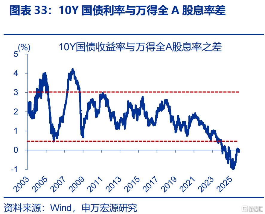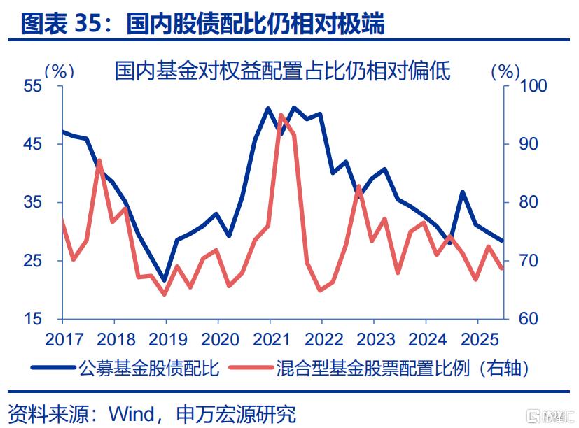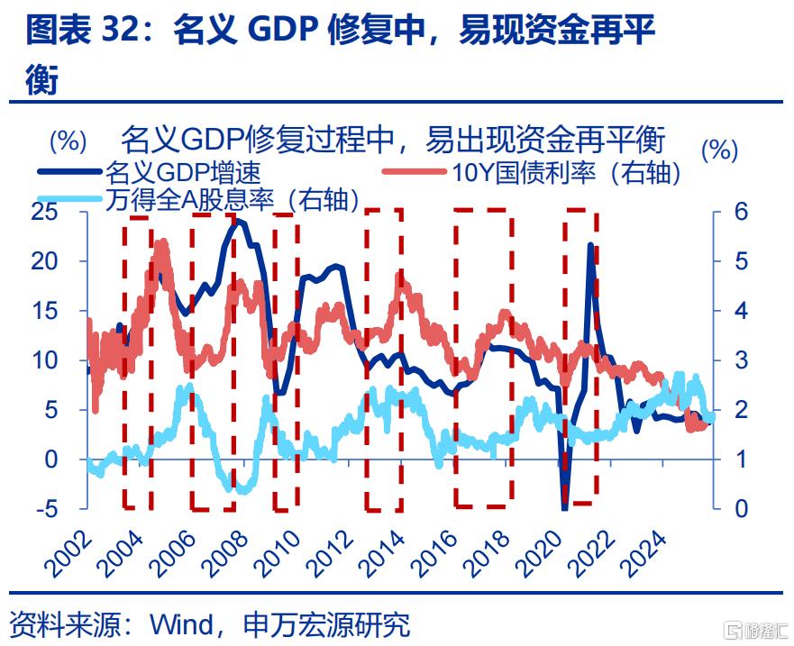 历史经验显示,名义GDP修复过程中,往往出现资金“再平衡”的延续。名义GDP修复往往带动资金“再平衡”、形成“股强债弱”格局。历史回溯来看,在名义GDP修复阶段,均出现了国债收益率上行与A股股息率的回落。而当下,市场运行“再平衡”至正常状态也仍有空间:1)10年期国债收益率与全A的股息率之差,大部分时段在1%-3%间震荡,0.5%-1%是市场的绝对底部,近期虽有修复,仍低于0%。2)1.8%的10Y国债利率仍远低于高分红股票3.2%的股息率。3)截至2025年年中,公募基金对债券配置比重升至股票的3.5倍,远高于2020年底时的2.0倍。14
