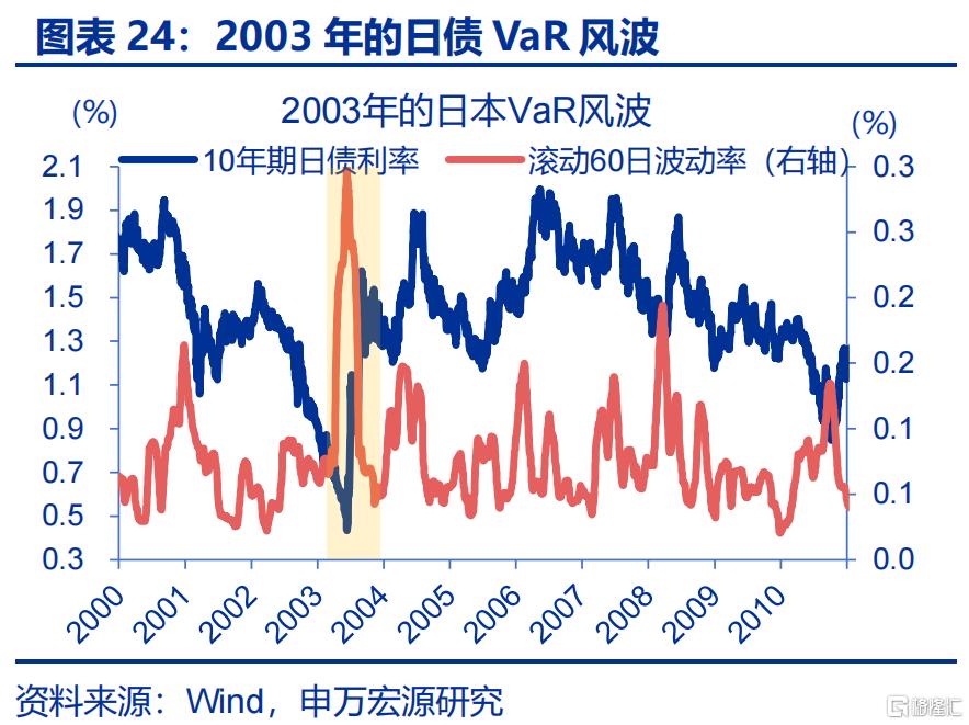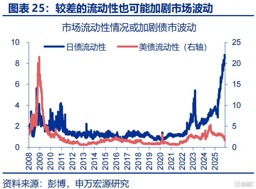 此外,去杠杆引发的流动性枯竭、风控模型引发的强制平仓等,也会在特定阶段加剧市场的波动。1)长期低波动或导致机构风控阈值收窄,一旦波动率突破临界点,模型或自动触发强制平仓指令,进而出现机械性抛售浪潮。2003年的日本即经历了典型的“VaR冲击”11。2)较低的市场流动性也可能加剧市场调整时的波动,例如2022-2024年美债一度出现深度不足,长期YCC政策的扭曲下日债也存在流动性不足,这些环境下债市的波动率往往会被放大。3)对冲基金高杠杆行为的逆转、机构非商业持仓头寸的极致化后的平仓同样也是潜在的风险来源。