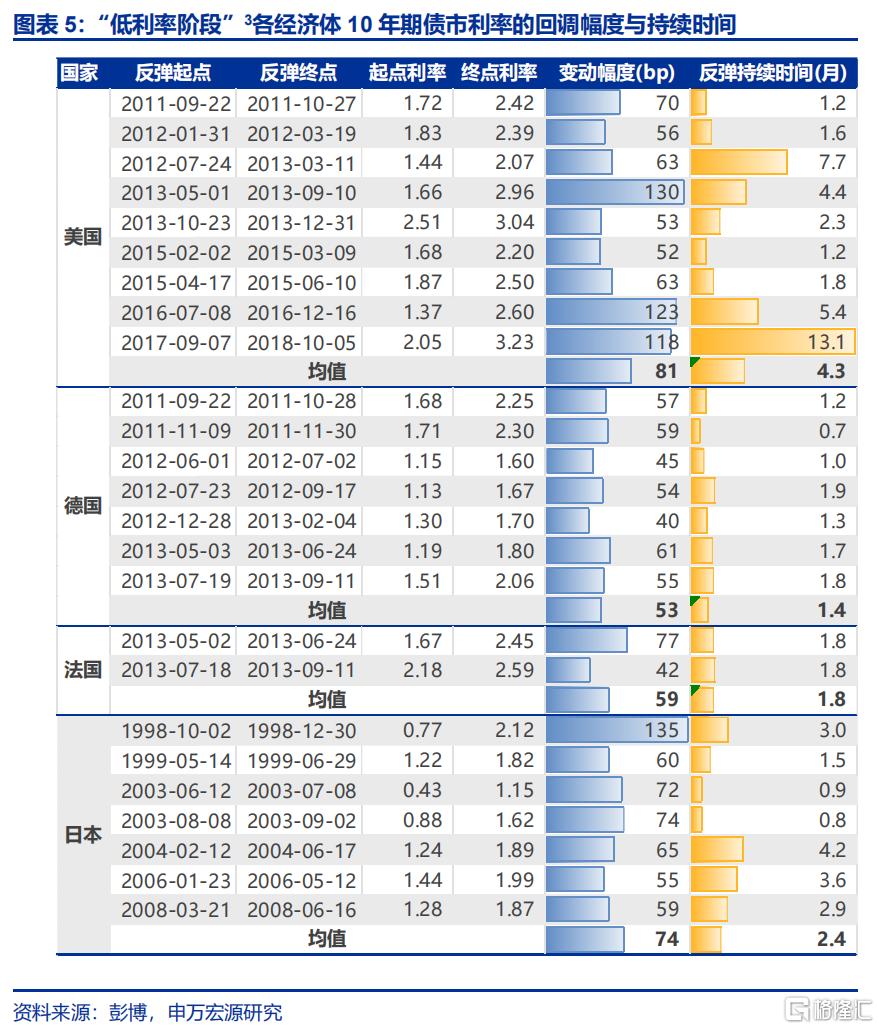 低利率环境下,海外债市的调整往往快速且迅猛,有三大特征:1)调整幅度较大,美、德、法、日的平均调整幅度分别为81、53、59、74bp;2)调整速度较快,这些调整通常发生在1-2个月内;3)调整往往伴随期限溢价走高,美法日的10Y国债利率回调幅度明显大于2Y国债。