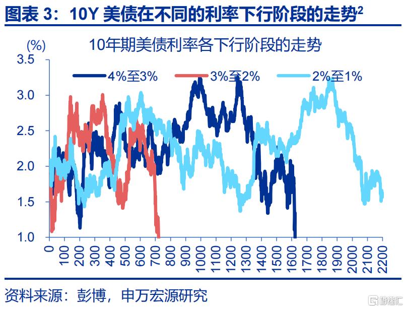 2 为使得三阶段比较更为直观,做标准化处理:“4%至3%”阶段的美债利率平减2%;“3%至2%”阶段的美债利率平减1%。