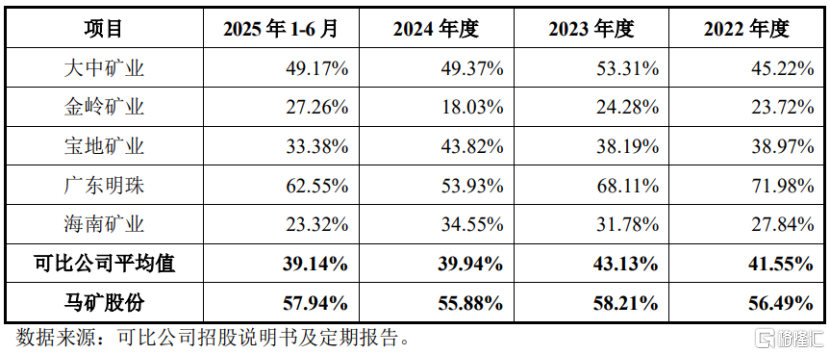 报告期内,马矿股份的主营业务毛利率分别为56.49%、58.21%、55.88%和57.94%,存在一定波动,公司主营业务毛利率高于同行业可比公司平均水平,主要系公司产品较为单一,与同行业可比公司业务模式、产品结构存在一定差异导致。