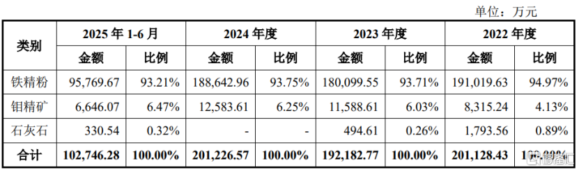 马矿股份主要产品为 TFe 65%的造球铁精粉和Mo 40%的钼精矿。2022年至2025年上半年(简称“报告期”),铁精粉产品为公司贡献了93%以上的营收,钼精矿的营收占比从4.13%提升至6.47%,石灰石的营收占比很低。