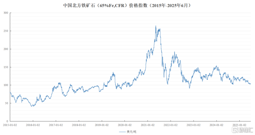 受宏观经济、铁矿石供需关系、海运价格等影响,近年来铁矿石价格波动较大。2016年左右全球铁矿石价格处于近十年低点,随着全球经济复苏,尤其是发展中国家房地产与基础设施建设投入的加大,钢铁行业景气度回升,铁矿石价格在2021年中达到历史高峰,而后价格回落。