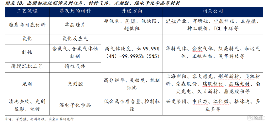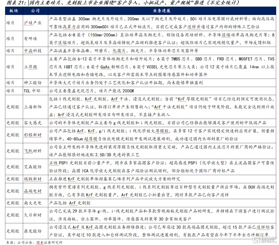 从产业链进展看,国内关键环节加速兑现,企业均围绕“客户导入、小批试产、量产爬坡、扩线/扩品类”推进,订单以认证驱动为主;产品上沿着更大尺寸/更高纯度/更低缺陷与更先进制程兼容演进,硅片侧聚焦150mm-300mm与器件级良率稳定,光刻胶侧围绕KrF、ArF逐步延伸,部分品类实现系列化供货。