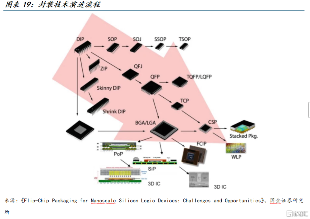 ③ 为了满足GPU更高I/O的需求,封装技术出现从“边”到“面”切换,如BGA/LGA把焊点搬到芯片底面,做成二维阵列,是过去主流的高I/O封装方式。此外,移动终端小型化的需求催化了CSP(芯片尺寸级封装)和WLP(晶圆级封装)的诞生。