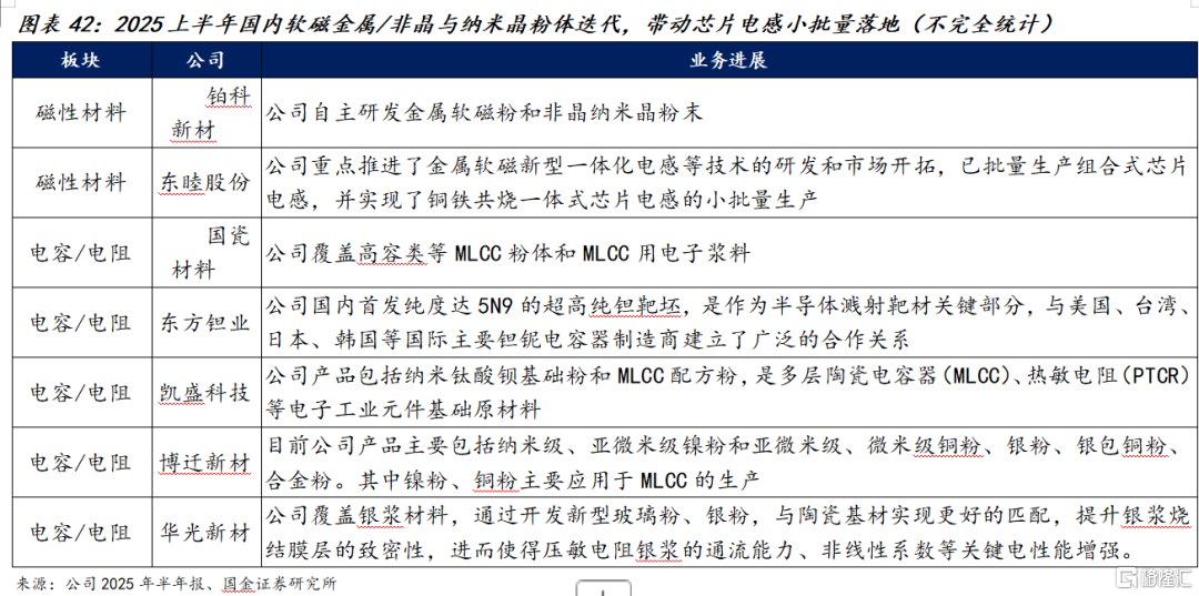 ⑤ 供配电材料:当前,单颗Blackwell GPU的功耗已超过1kW,DGX B200系统(配备8个Blackwell GPU)的总热设计功耗约为14.3kW。预计Rubin和Feynman等后续架构将在此基础上增加两倍甚至五倍。能源利用效率和低损耗将会是配电材料未来重要方向。2025年上半年产业端稳步推进:软磁金属/非晶与纳米晶粉体迭代带动一体化电感与芯片电感小批量落地;面向MLCC/热敏电阻的纳米级钛酸镁钙等基础粉、银粉/银浆与铜粉体系加速国产替代;5N级超高纯铝电极材料实现国产突破,带动铝电容与相关电子浆料的安全供给。
