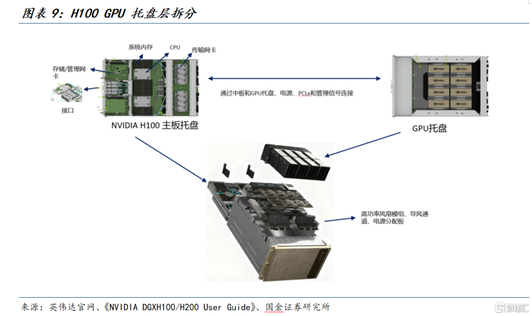 整机层:当GPU托盘与主板托盘、电源与配电(PSU/PDB)、风扇与风道、结构与面板、网络与本地存储等子系统集成进同一机箱后,即构成DGX H100整机节点。