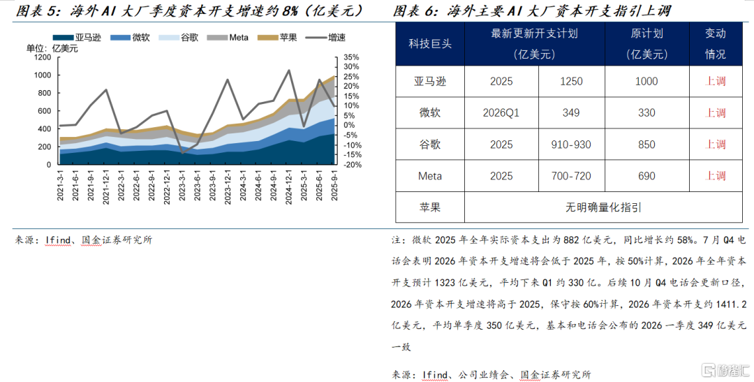 海外头部AI应用厂商资本开支持续加速,上调指引指向2026年成为硬件投放大年并带动上游材料需求走强。过去五年,其季度资本开支平均环比增速约8%,分项看亚马逊、微软、谷歌、Meta近两年投入斜率明显抬升;从最新指引与披露看,亚马逊2025年资本开支计划约1250亿美元(较此前1000亿美元上调);谷歌2025年指引约910–930亿美元(较此前850亿美元上调);Meta维持2025年700–720亿美元并上调区间上限;微软管理层在2025年Q4与2026年Q1电话会中均给出更积极展望。
