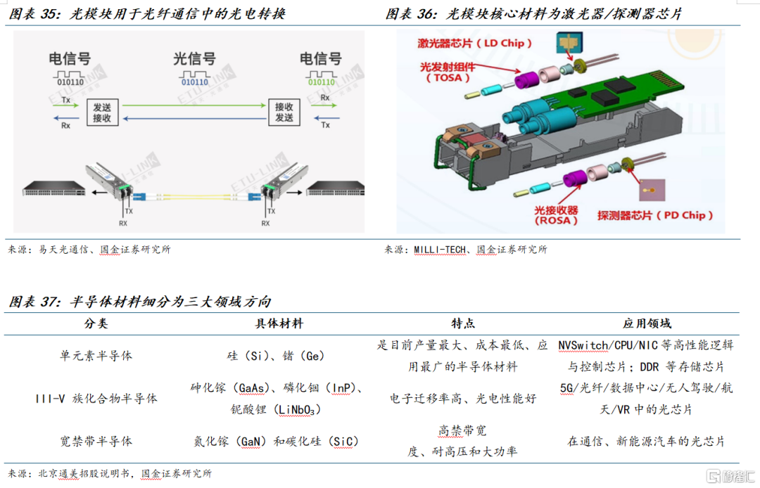 光学材料主要应用在DGX H100光模块中,其组成部件主要为激光器芯片、光发射组件、光接收组件、探测器芯片。光模块主要作用是实现光纤通信中的光电转换和电光转换,发送接口输入一定码率的电信号,经过内部的驱动芯片处理后由驱动半导体激光器(LD)或者发光二极管(LED)发射出相应速率的调制光信号,通过光纤传输后,接收接口再把光信号由光电检测转换成电信号,并经过前置放大器后输出相应码率的电信号。