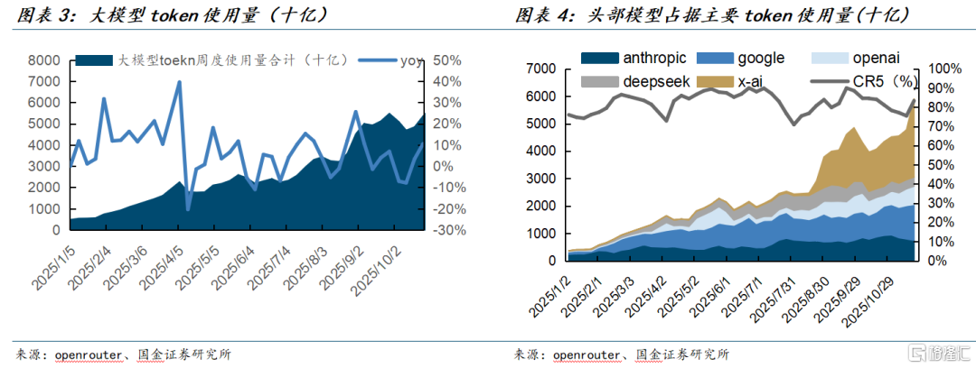 下游需求快速放量,头部模型贡献度高。根据openrounter,截至2025年11月,大模型周度token使用量已升至7.08万亿,较年初扩大约13倍,生成式AI在多行业、多场景的使用强度显著提升;从结构看,Anthropic Claude、Google Gemini、OpenAI GPT、DeepSeek 与 Xai Grok 五大系列合计周度使用量约5.9万亿,占比约83%,CR5维持高位,表明需求主要由头部模型驱动,市场呈现规模化扩张与集中度提升并行的态势。