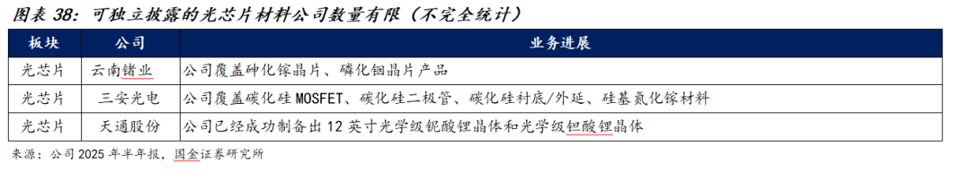 2025年上半年,国内光芯片衬底与关键晶体材料进展整体稳步推进,但可独立披露的材料公司数量有限,主要因下游光模块/IDM厂商普遍采取垂直一体化与联合开发模式,晶圆外延、键合与晶体加工高度绑定客户认证周期,供应链外溢度低。