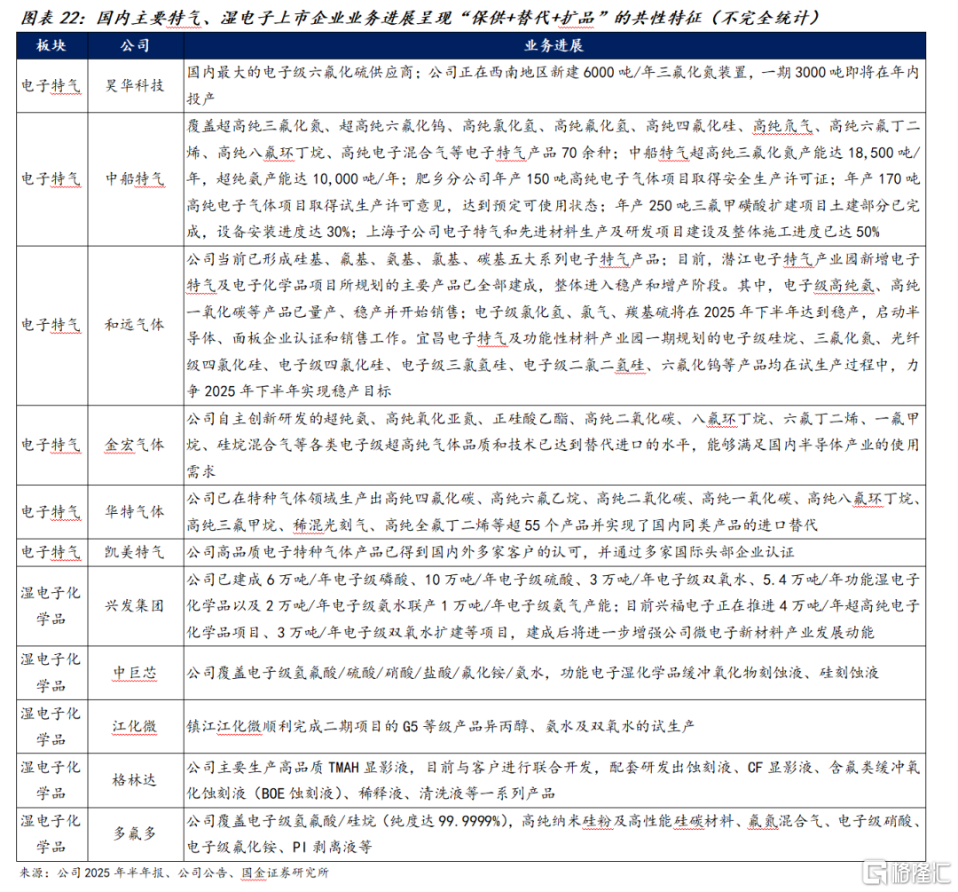 电子特气与湿电子化学品板块整体呈现“保供+替代+扩品”的共性特征:一方面,围绕集成电路制造对高纯度、稳定供给的刚性需求,企业普遍以新建/扩建装置与本地化产线为抓手,形成从电子级硫化氢、氟化氢、四氟化碳、六氟化硫、氨/氮/氩混合气到特种掺杂气的多品类矩阵,部分品种实现对进口主力的可替代与规模化出货;另一方面,湿电子化学品在G5及以上等级的纯度、颗粒和金属离子控制上持续爬坡,产品覆盖电子级硫酸/硝酸/氢氟酸/过氧化氢/氨水及显影、去胶、清洗与配套溶剂,打通客户认证到量产路径。