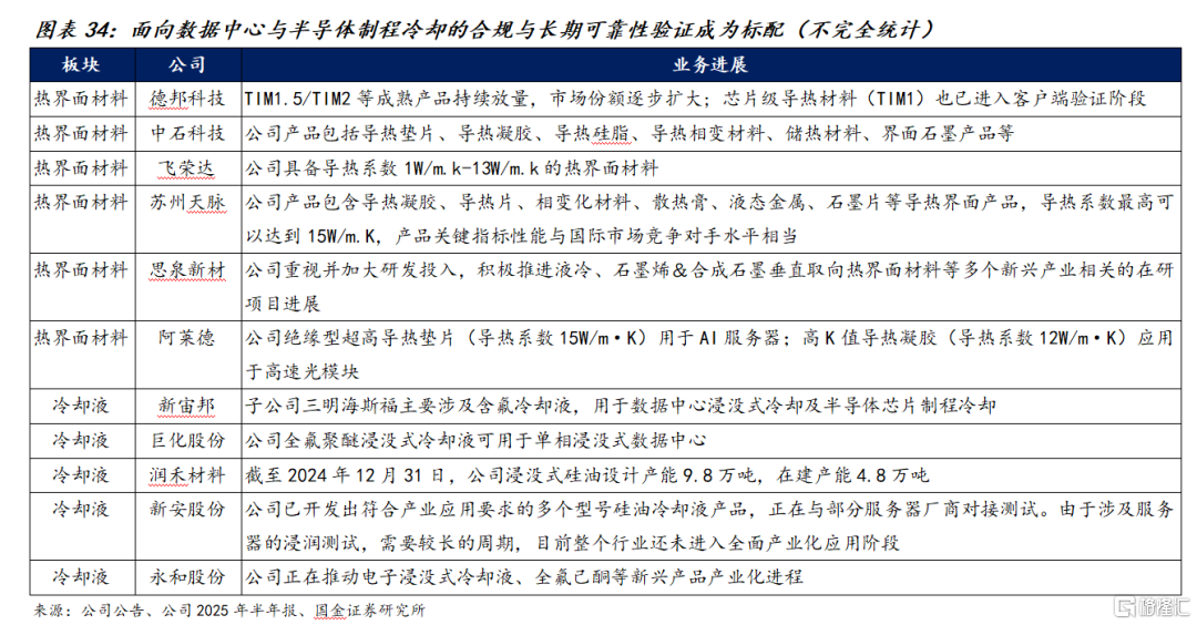 ③ 导热散热材料:受益于算力需求的持续攀升与机架功率密度提升,散热材料正成为数据中心基础设施的关键增量环节,散热主要应用在GPU核心裸晶、封装盖板、HBM堆叠存储、高速接口芯片、存储、电源等,从产业端2025年上半年情况来看,热界面材料端围绕相变/石墨/金属与复合体系并行推进,液冷介质企业普遍扩建浸没/冷却液产能,全氟/烃基/硅油等路线并行,面向数据中心与半导体制程冷却的合规与长期可靠性验证成为标配。