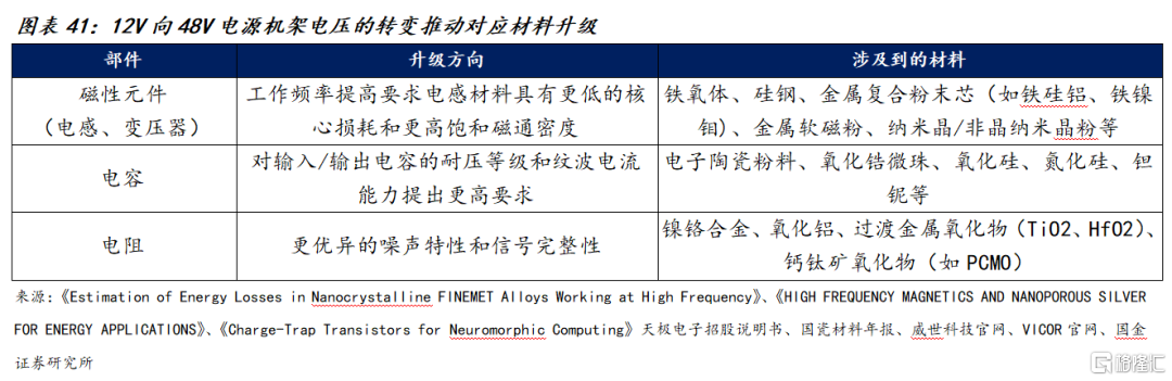 ① 磁性元件(电感、变压器):48/54V架构与更高开关频率推动磁性材料向“低损+高饱和+高温稳定”迭代。涉及到的材料包括:铁氧体、金属复合粉末芯(铁硅铝、铁镍钼、铁硅)、非晶/纳米晶软磁合金等