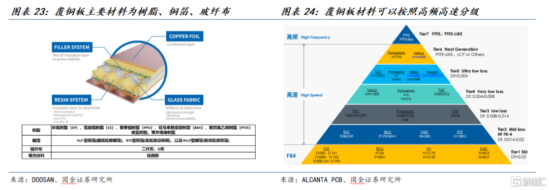 覆铜板是制造印制电路板(PCB)的基础材料。H100整机中涉及多层高速、高功率密度的 PCB/载板/背板,均以覆铜板为核心基材或其延伸材料。具体包括GPU UBB、主板、交换机主板等。覆铜板主要材料包括:树脂、铜箔、玻纤布、填充材料,按介质损耗因子 Df 从大到小把PCB基材分成多个Tier,Df越小,越适合更高的速率或更高的射频/微波频段,材料也更贵、工艺更难。