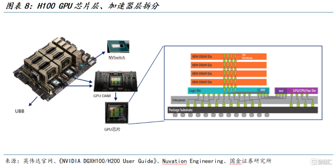芯片层:最底层的H100 GPU芯片是算力核心。在H100这一代,HBM是和GPU核心一起做成同一个封装的,通常是“GPU核心裸片+多颗HBM堆叠+封装基板”组合在一起。GPU裸片和HBM直连显著提升模型参数与激活数据的就地吞吐,降低访存瓶颈。另外,GPU芯片内还集成NVLink控制器,等同于GPU自带NVLink接口能力,从这颗芯片的封装边缘连到外部的互联载体,比如插在UBB上,经由走线连到NVSwitch芯片,再到其他GPU,为后续多GPU的点对点互联提供物理通道。这一层可以视为“发动机”,具备能效密度优势,但尚不具备系统落地所需的供电、散热与标准接口能力。