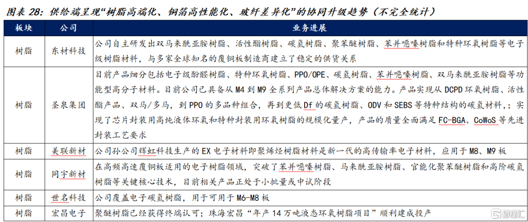 ② 覆铜板材料:H100整机中涉及多层高速、高功率密度的PCB/载板/背板,均以覆铜板为核心基材或其延伸材料。具体包括GPU UBB、主板、交换机主板等。主要材料包括:树脂、铜箔、玻纤布、填充材料。从产业推进情况来看,供给端呈现“树脂高端化、铜箔高性能化、玻纤差异化”的协同升级趋势。