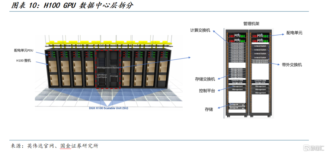 数据中心层:整机节点需要与机柜配电和机房基础设施配合,多个DGX H100节点按安装在标准机柜中。机柜上方会配有PDU(配电单元),负责回路分配、计量与保护等任务,配合机房的冷热通道设计,形成可预期的热功耗边界条件与维护策略。此外,为了让H100整机能够高速协作,机柜会配有专门的管理机架,包含高带宽的计算交换机、连接存储的交换机、带外管理交换机、管理服务器、管理存储。