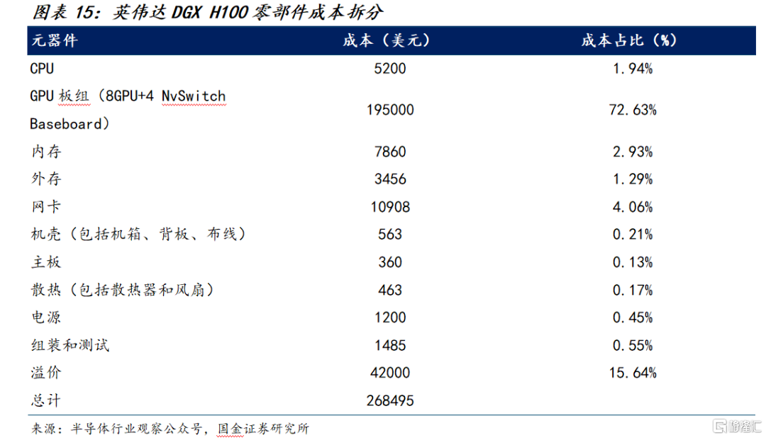 相比通用服务器,AI服务器在AI芯片与内存带宽上大幅增强,整机价值量随之上移,其他配套部件也相应升级。根据半导体行业观察披露的数据,NVIDIA DGX H100 GPU板组(含HBM)占整机价值约73%,存储约4%,封装0.55%,电源0.45%,散热部件0.13%。