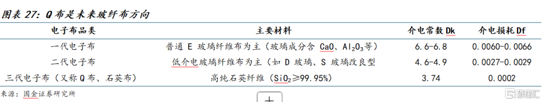 玻纤布是覆铜板的“骨架”,决定板材的尺寸稳定性与机械强度,并直接影响高速信号的一致性。产品从普通E‑glass(也称一代电子布)向低介电玻纤(二代布,如D玻璃、S玻璃改型)再到石英布(三代布,高纯SiO2)迭代,介电常数与损耗系数逐级下降:E‑glass约Dk6.6/Df0.0006,二代约Dk4.6/Df0.0027,石英布可降至Dk3.74/Df0.0002,是玻纤布材料升级方向。