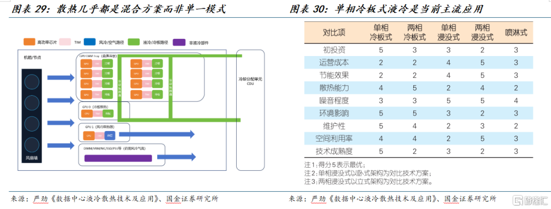 当前,单相冷板式液冷在液冷数据中心的应用占比达90%以上,是现阶段及未来一段时间业内主流的液冷技术方案。单相浸没式液冷节能优势更突出,且近年来该技术逐步趋于成熟,相关产业链快速发展完善,小规模商用不断推进。而喷淋式、两相冷板式、两相浸没式这3种液冷方案的技术研究和产业生态尚需完善。