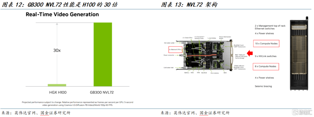 此外,相比于DGX H100 SU这种由多台H100组成的服务器机柜,新一代的高性能AI服务机柜更倾向于采用“超节点”架构。比如,NVL72就是典型的“机柜级超节点”,一柜内有72块GPU,机柜内通过 NVLinkSwitch 全互联,侧重在“单柜内做成一个大算力域/超节点”以达到更高的性能。从结构上来讲,超节点架构主要是改变了互联的方式,域内GPU不再需要外部交换机,更高密度的集成也需要匹配更高功率模块、高性能散热等。