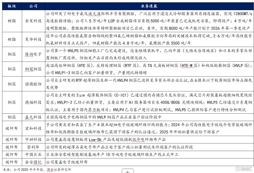 纵观2025年上半年国内覆铜板关键材料企业进展,供给端呈现“树脂高端化、铜箔高性能化、玻纤差异化”的协同升级趋势:树脂环节加速向低介低损、耐高温与环保配方迭代,国产厂商在环氧、聚酰亚胺、PPO/OPE、烯烃类以及LCP等体系上推进工程化与客户验证,部分已切入高频高速与IC载板用材;铜箔环节围绕HTE/RTF/低轮廓(HVLP/超低粗化)持续扩产和工艺降损。面向服务器、AI加速卡和高多层板需求的高强度、低粗化铜箔成为主线,龙头推进万吨级产能与国际客户认证;电子布环节聚焦超薄化、高强高模与低介电玻纤布。