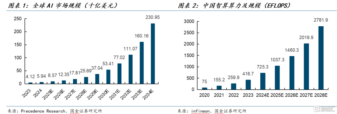 算力成AI发展的核心要素,全球与中国智能算力均进入高速扩张期。受大模型训练与推理需求拉动,全球算力规模快速攀升。根据IDC、Gartner、TOP500及中国信通院预测,全球算力将由2023年的约1397 EFLOPS增长至2030年的约16 ZFLOPS,2023—2030年复合增速约50%。中国方面,IDC数据显示,中国智能算力将由2024年的725.3 EFLOPS提升至2028年的2781.9 EFLOPS,2020—2028年复合增速达57.1%。