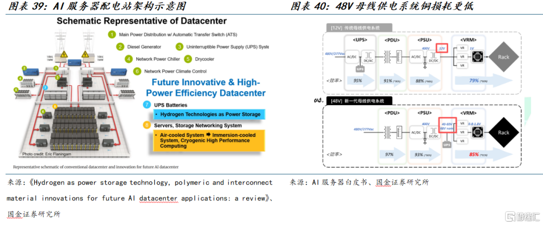 AI数据中心的配电设备整体形成“市电/柴油—ATS—UPS/电池—低压配电/母线槽—机柜PDU—PSU—VRM—芯片”的端到端冗余链路。当前,Blackwell GPU的功耗已超过1kW,预计Rubin和Feynman等后续架构将在此基础上增加两倍甚至五倍。此外,需要注意的是,整个服务器系统由多个GPU组成。例如,DGX B200系统(配备8个Blackwell GPU)的总热设计功耗约为14.3kW。由于AI服务器所需电源功率更大,因而带来耗电量的大幅提升,为满足新时代节能减排的要求,全球政府和能源组织都在推动强制性法规,以提升数据中心的能源效率。
