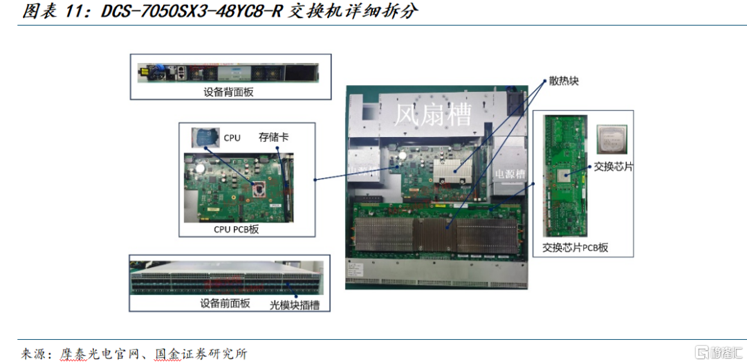 交换机的构造类似于主机。计算/带外/存储交换机都有共同的骨架:主PCB承载交换ASIC,前面板是SFP/QSFP笼体,后部是可热插拔PSU与风扇,控制板/CPU在中部,风道前冷后热(或反向)设计。AI数据中心的计算交换机或高性能存储交换机需要更高功耗、更高速口、更强散热与多ASIC互联的机型,但大体构成都是基本五件套:交换ASIC、前面板端口与光模块、控制CPU、电源/散热、机箱/背板。